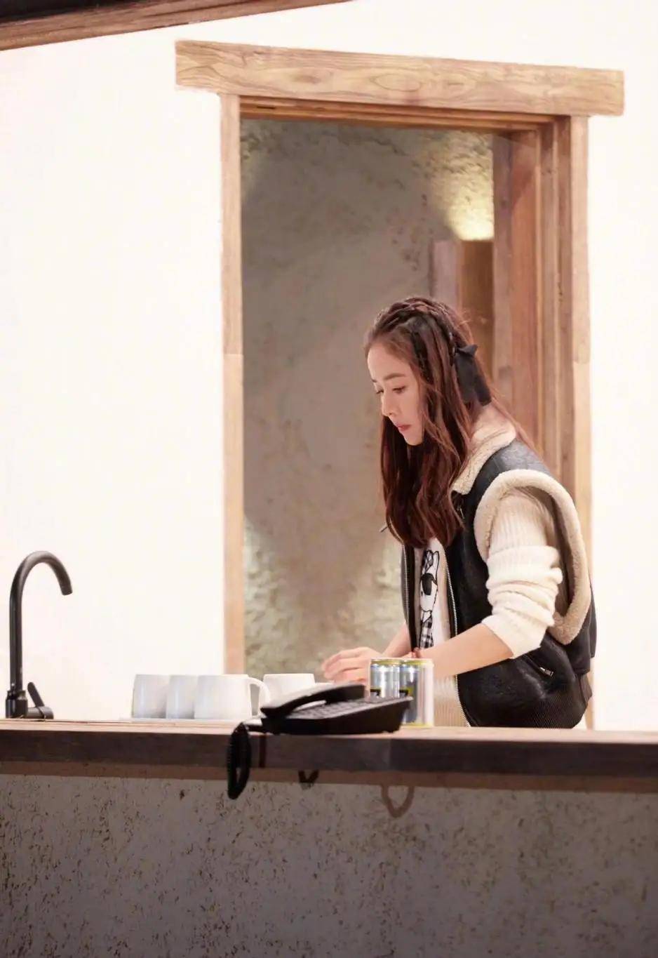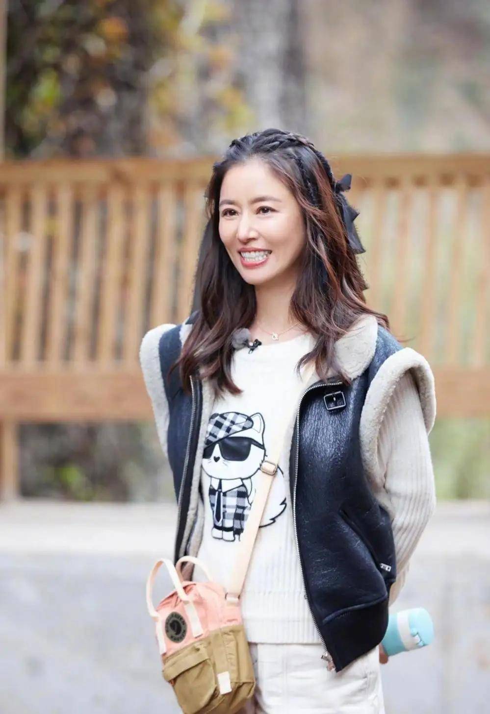 脱下厚重的羽绒服,林心如示范了室内或暖冬时节的满分叠穿模板:微卷发 + 设计感马甲 + 趣味毛衣。